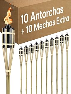 Antorchas Jardín en Bambú 90 CM - 10 Antorchas con 10 Extra Mechas - Larga Duración del Fuego - Recargables